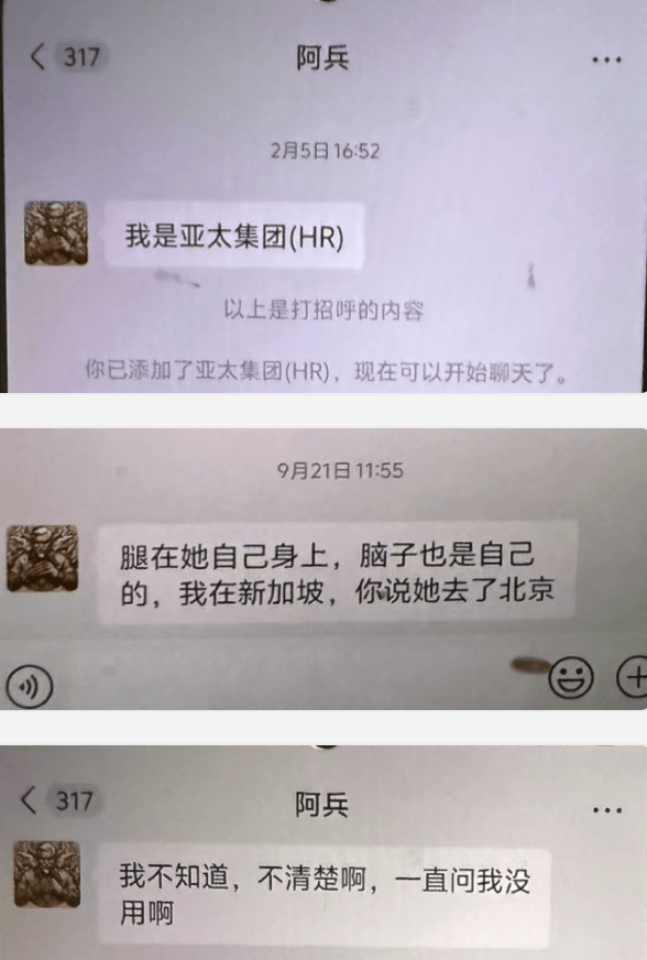此外,“阿兵”在今年2月份便邀请许雅婷前往新加坡工作,而他个人信息显示为“亚太集团(HR)”。“我们查了这个亚太集团,是个园区,2月份我妹妹就没去了。”裴女士告诉记者,“阿兵”对此次许雅婷失踪讳莫如深,他在微信中对家属说道:“腿在她自己身上,脑子也是自己的,我不知道,我不清楚。”