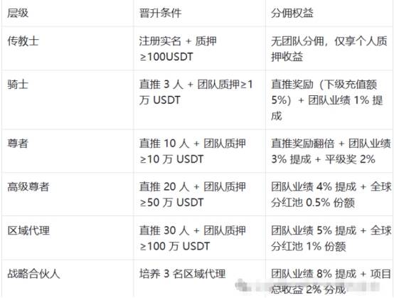 ARK DeFAI 学奥拉丁搞 “分级割韭菜”,设了 “传教士 - 骑士 - 尊者” 六个等级,拉新分拥规则很诱人:团队一个月存够 100 万 USDT,就给 12888 元现金奖励;拉来的人第一次充米,还能拿 5% 的反现。可这体系层级多达 12 级,完全符合《刑法》里传消罪 “分级拉人、靠利诱吸引人” 的特征,和 2023 年 “PlusToken 传消案” 的玩法没区别。