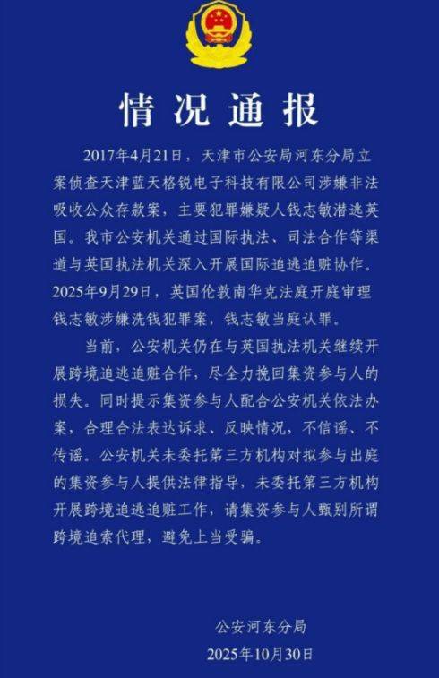 从2014年天津蓝天格锐的“科技理财”骗局,到2017年伪造护照潜逃英国,再到2024年在约克被捕,出生于江苏如皋,取得专科学历却号称可以给你“三世富贵”的钱志敏,用七年时间演绎了从财富神话到阶下囚的完整循环。